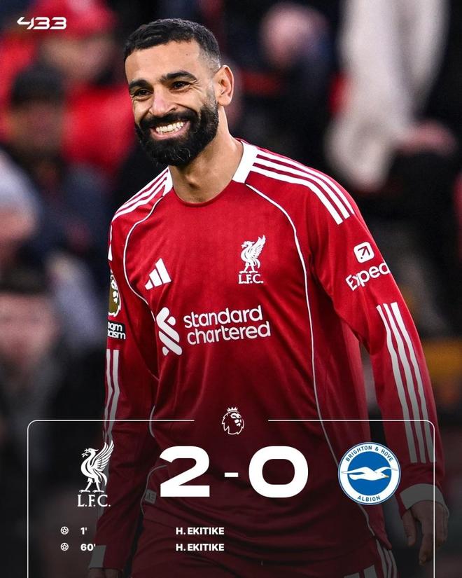 利物浦主场2-0布莱顿,排名第六。埃基蒂克46秒闪击破门,戈麦斯伤退,萨拉赫替补,下半场助攻埃基蒂克头球梅开二度。